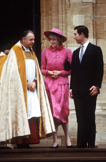 Спустя год Диана продолжила демонстрировать легкие, наивные и романтические образы. В 1982 году на рождественской службе в часовне Святого Георгия Диана сделала ставку на нежно-розовый цвет, в котором были выполнены парчовая юбка и жакет с поясом и необычным воротником. Завершающим акцентом образа стала шляпа в тон. На фоне Чарльза Уэльская выглядела ярким пятном — на это и была ставка.