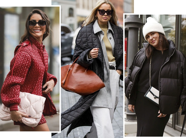 С пуховиками хорошо смотрятся дутые сумки — «подушки». Модели могут быть разными: как с ручками, так и клатчи. Они напоминают текстуру пуховика и создают общий уютный образ. Но за счет того, что сумка большая и стеганая, это выглядит стильно и актуально, без лишних недостатков «комфортного образа». Приятным бонусом будет, если вы добавите к образу перчатки из аналогичного материала. В этом сезоне много вариантов этого аксессуара, в том числе по цветовой гамме. Все зависит от вашего стиля и предпочтений.