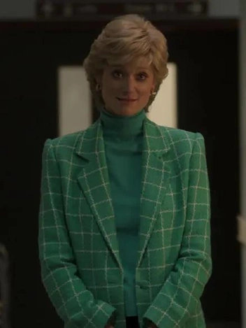 Здесь же появляется эффектный комплект из нежно-зеленого жакета в клетку и свитера с высоким воротом того же оттенка. Этот наряд больше всего напоминает бирюзовые жакет и водолазку, которые принцесса Уэльская продемонстрировала в аэропорту Цюриха, когда она прибыла на лыжный курорт в Австрию в 1992 году.