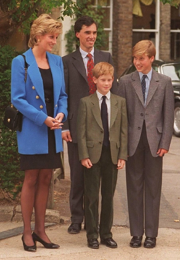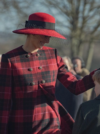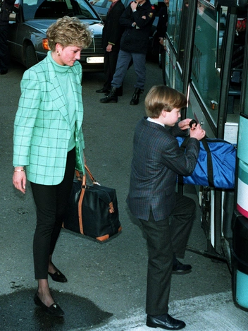В этой же серии принцесса Диана провожает своего старшего сына в Итон. Образ Уэльской костюмеры повторили с высокой степенью детализации, надев на актрису черные юбку и топ, темные колготки и ярко-голубой удлиненный жакет с крупными золочеными пуговицами, дополненный сумкой на цепочке.
