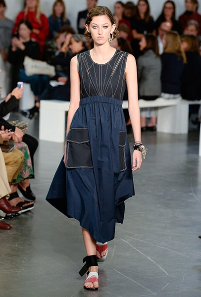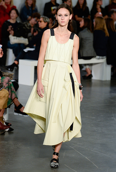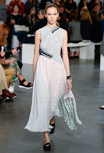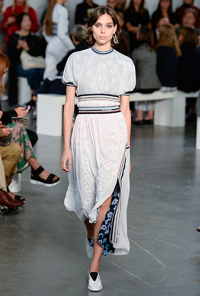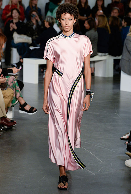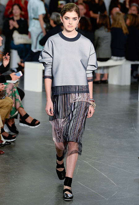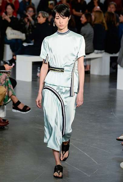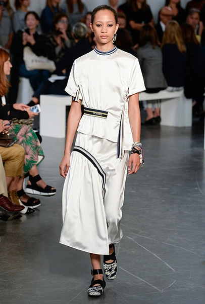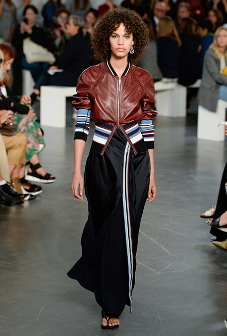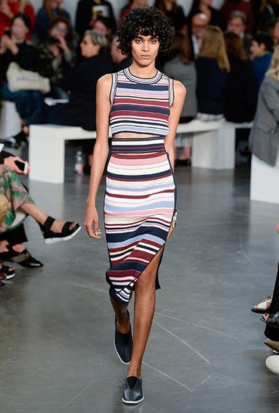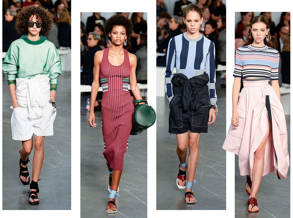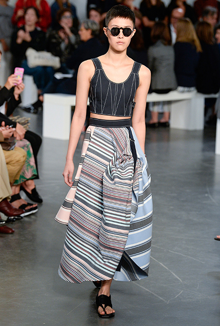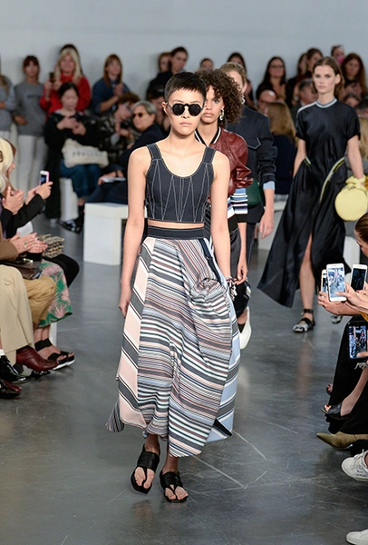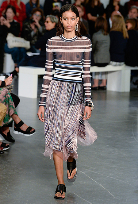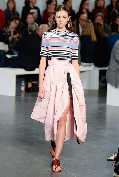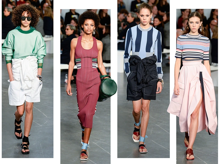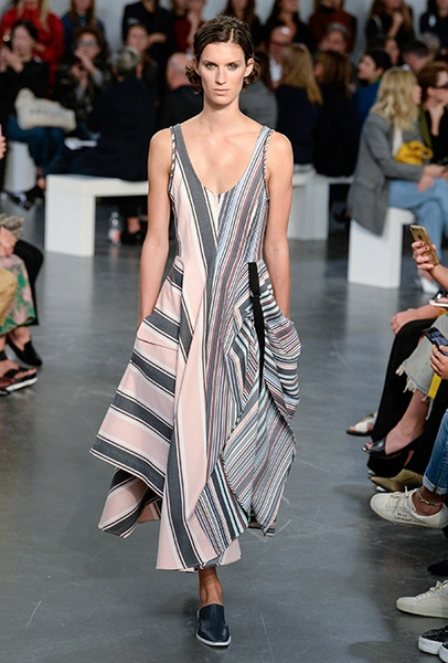 На подолах длинных юбок и шелковых платьев полоски формируют стремительный полукруг, придавая даже таким конвенционально женственным вещам отдаленное сходство с экипировкой спортсменов.