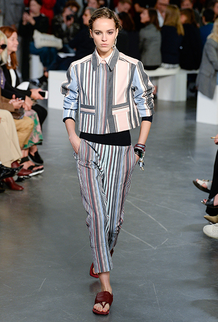 Разноцветными полосками же, как вертикальными, так и горизонтальными, расчерчены манжеты на рукавах укорочённых кожаных курток, воротники платьев, пояса на приталенных пальто. Некоторые вещи здесь полностью в полоску ─ например, брючный костюм с укорочённым жакетом или длинный сарафан с ассиметричным низом.