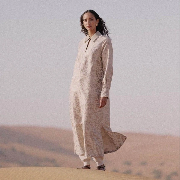 Главные герои капсулы — платья: модель с рубашечным воротником, приталенное миди из парчи с перламутровым переливом и длинное кимоно с тонким поясом. Цветовая гамма выдержана в светлых тонах — бежевом, розовом и золотистом.