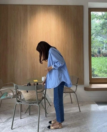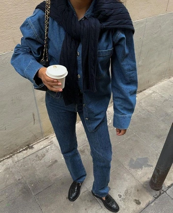 Mom fit — фасон, лишенный яркой изюминки. Поэтому усложняем его верхом — например, джинсовой рубашкой. Модные девушки на стритстайле сочетают светлые джинсы и более темную рубашку — разница в оттенках придает динамики.