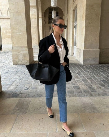 Поскольку фасон этих джинсов лаконичен как смс бывшего, образ нужно разбавлять чем-то ярким и трендовым. Например, балетками: классическими с миндалевидным мысом и бантиком; в стиле Мэри Джейн с ремешком сверху; или даже кроссовками-балетками, как Puma Speedcat.