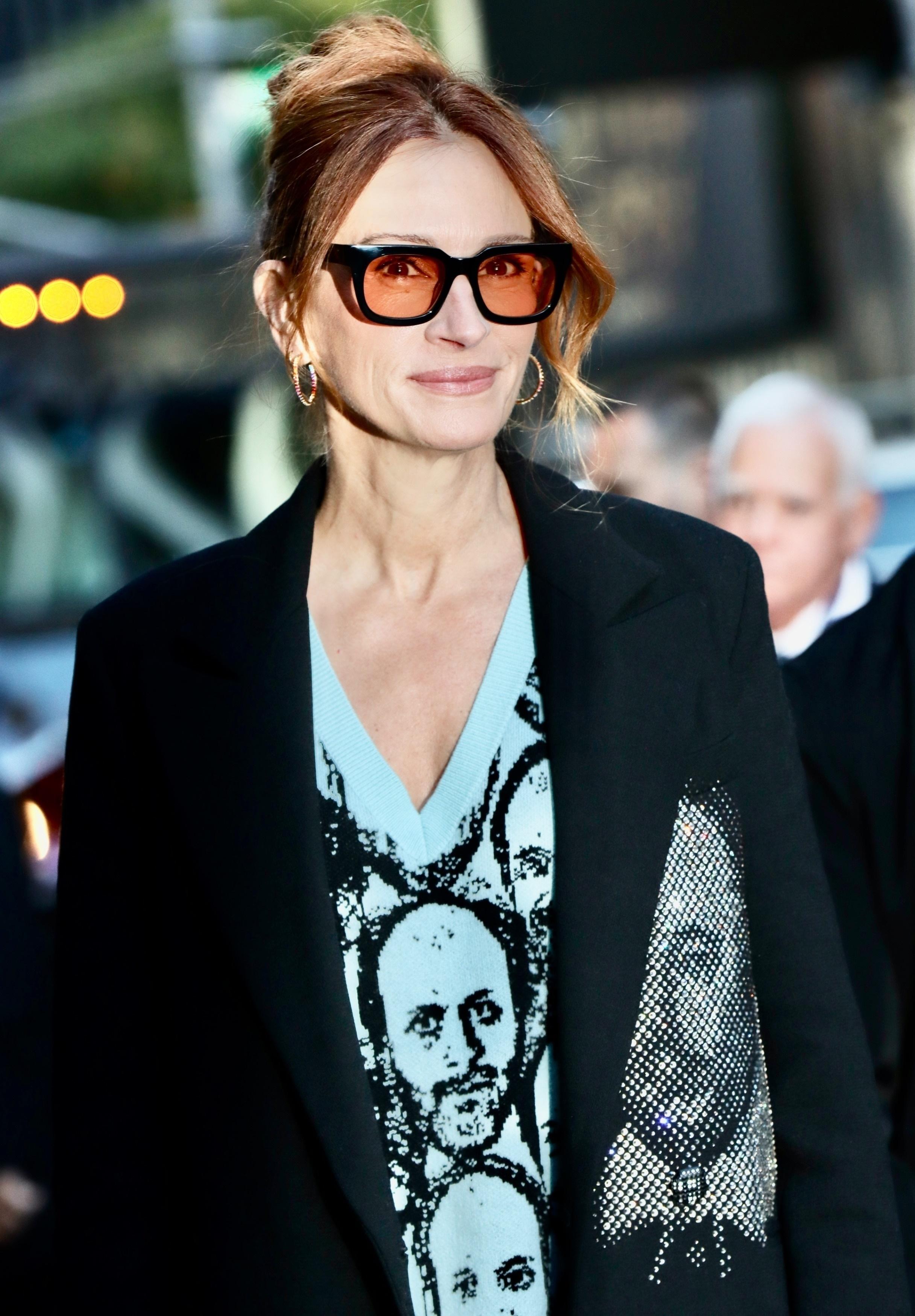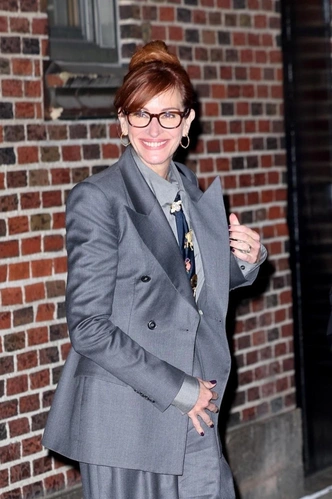Папарацци застали звезду, когда она уходила со съемок «Позднего шоу со Стивеном Кольбером». В тот вечер на ней был объемный серый костюм c вытянутыми лацканами на жакете, слегка приталенным силуэтом и брюками мужского кроя. В пару к нему Робертс выбрала рубашку и темно-синий галстук с принтом — аксессуар, ставший главным акцентом ее образа.