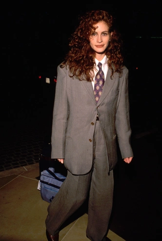 Авторство наряда принадлежит Дому Armani. Однажды Джулия рассказывала, что в начале своей карьеры не до конца понимала, что на крупные премии нужно обязательно приходить в вечернем платье. Поэтому она просто зашла в магазин и купила подходящий костюм «прямо с вешалки» незадолго до мероприятия. Так практически случайная покупка смогла полностью перевернуть модные правила — теперь костюмы стали неотъемлемой частью красных дорожек.