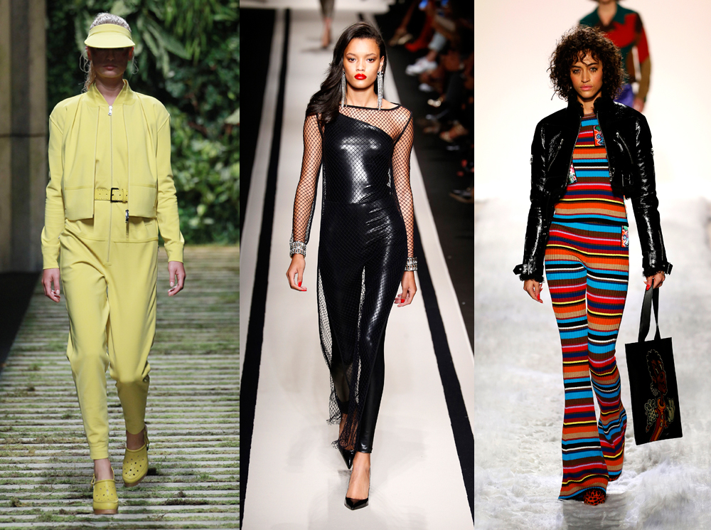 Комбинезоны на подиуме давно уже не новость, поэтому в последних весенне-летних коллекциях они скорее поддерживали существующий тренд, нежели были самостоятельным стилеобразующим элементом. Вечерние кэтсьюты и дань модным 80-м в виде «леопарда» и воланов появились у Elisabetta Franchi, неоновый монохром и тропический принт – у Max Mara, спортивная тематика – у Hugo Boss и DKNY, Комбинезон «а-ля трико» у Джереми Скотта и серебристый вариант с цветочной вышивкой у Temperley London.