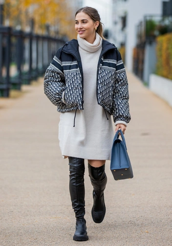 Длина пуховика, как и его крой и цвет, тоже способны как улучшить ваш внешний вид, так и напрочь стереть любые намеки на гармоничный аутфит. Более того, именно неправильно подобранная длина способна нарушить пропорции, сделать из вас бесформенное нечто или визуально уменьшить рост. Поэтому делайте выбор в пользу укороченных моделей, которые подойдут под юбки макси, миди или мини. Не менее удачная альтернатива — длинный пуховик, полностью закрывающий ваш наряд (читайте также: Спасение зимой: как правильно выбрать длинный пуховик под свой рост (и с чем его носить)). Правда, с ним тоже стоит быть осторожной: ваша верхняя одежда должна полностью закрывать ваш наряд, поэтому юбка или платье макси не подойдут.