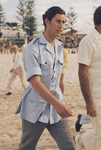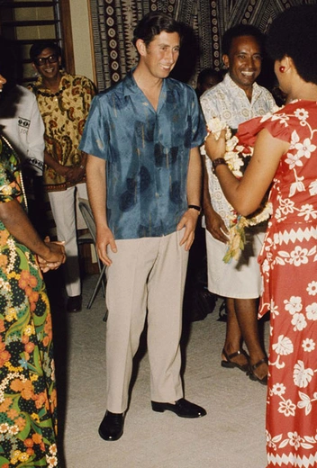 Хотя мы привыкли к тому, что Карл с юных лет носит классический английский стиль, в молодости он любил экспериментировать с трендами. Например, во время тура по Западной Африке в 1977 году примерил рубашку с коротким рукавом и принтом tie-dye — не самый очевидный, но крайне актуальный для монаршего модника шаг.