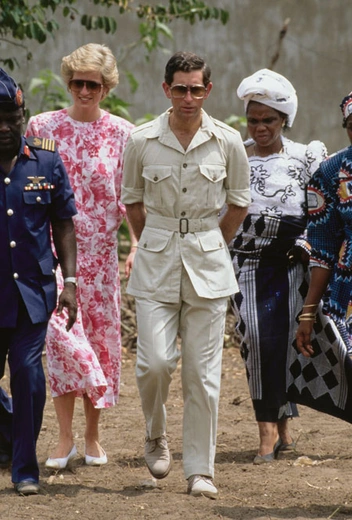 Расслабленный стиль сафари был одной из самых популярных тем в королевских гардеробах с 70-х до 90-х годов. Один из самых стильных вариантов Карл показал во время прогулки по тропическому лесу в Камеруне. Здесь — все главные маркеры этого направления: рубашка с укороченными рукавами и поясом в песочном оттенке, вдохновленная Ивом Сен-Лораном, свободные брюки, удобная обувь (кроссовки!) и очки с полупрозрачными линзами.