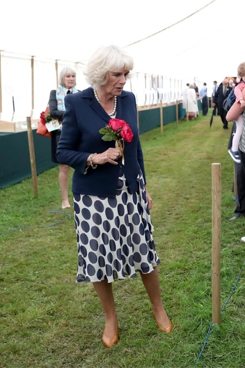 Полька дот — это один из любимых принтов женщин БКС, и Камилла предпочитает крупный (читайте также: Полька-дот: как королевские особы носят трендовый «горох»). Впервые она надела платье в синий горох от Фионы Клэр в 2009 году в Венеции, дополнив его жемчужным ожерельем и темно-синим пиджаком. Королева показывала этот образ через пару месяцев того же года, и на протяжении десяти лет после (меняя только обувь и сумки).