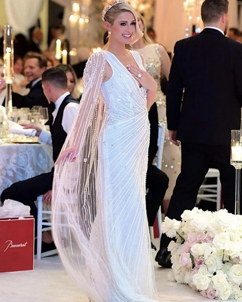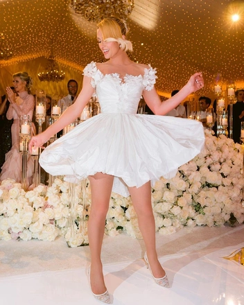 Позднее селебрити вновь сменила наряд — на этот раз невеста облачилась в короткое платье Oscar de la Renta, цветочные детали на котором повторяли первый образ Пэрис. И еще один не менее эффектный наряд — платье Pamela Rolland в пол с высоким разрезом, расшитое жемчугом. Образ дополнил полупрозрачный кейп и тиара.
