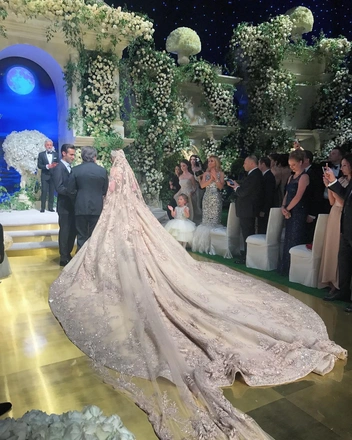 Роскошное кружевное платье, инкрустированное драгоценными камнями, весило 25 кг. По истине королевский образ венчала длинная фата, которую невесте помогали нести сразу несколько девушек. По разным оценкам экспертов, платье могло обойтись паре в 25 миллионов рублей. Но ради такого события не жалко никаких средств! (читайте также: Elie Saab создал свадебныйо наряд за 27 млн руб. для невесты сына Гуцериева).