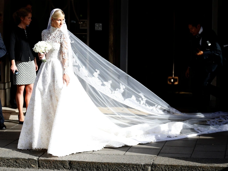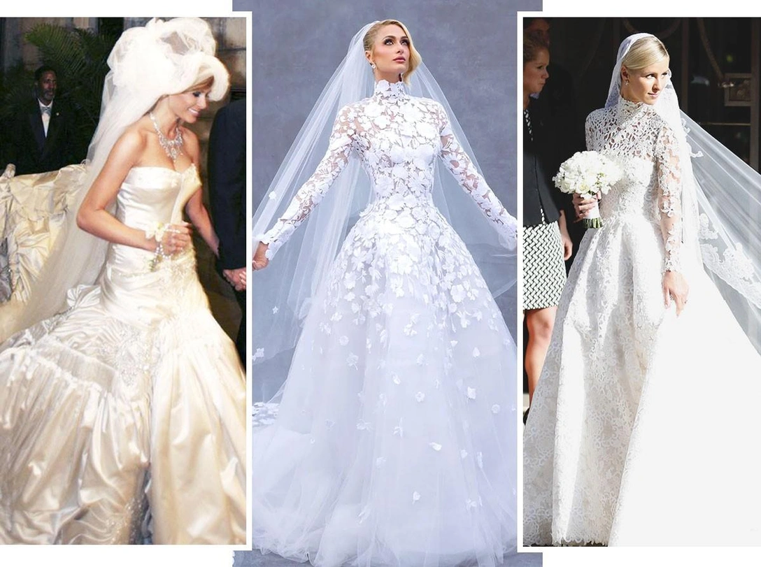 Под венец Хилтон шла в созданном специально для нее платье Oscar de la Renta, над которым трудились дизайнеры модного Дома Фернандо Гарсия и Лора Ким. Наряд с высоким воротом и длинными рукавами из кружева был украшен белыми цветочными бутонами.