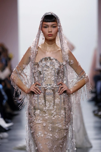 В качестве дополнения к платьям — объемные накидки-кейпы из плотной атласной ткани, которые немного уравновешивали обилие блеска. Привлекли внимание и накидки на голову из тонких тканей, обильно расшитых стразами (читайте также: Культ золота и хейт Кендалл Дженнер: как прошел кутюрный показ Schiaparelli).