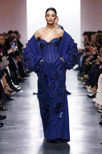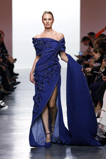 Неожиданно для всех, Эли Сааб решил изменить наше отношение к джинсовой ткани. А именно, пошил из нее несколько вечерних платьев классического облегающего силуэта с пышной юбкой. Некоторые из них были украшены темно-синими цветами с бисером и пайетками, а также корсетом, который подчеркивала вертикальная строчка светло-коричневых нитей. Это действительно инновационное решение — не только потому, что Elie Saab редко отходит от классических тканей, но и из-за исторического предназначения джинсового материала. Раньше в джинсах ходили только рабочие, так как они редко пачкаются, не растягиваются и долго служат.