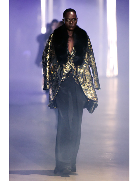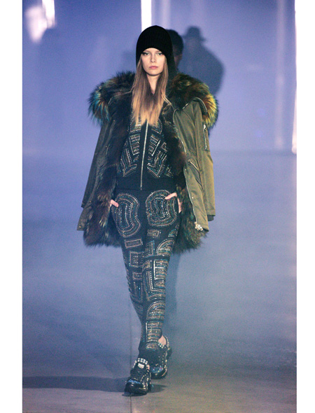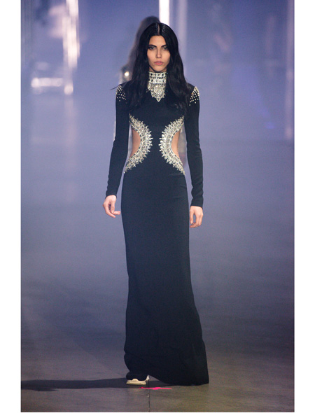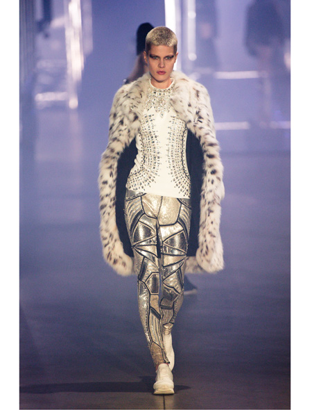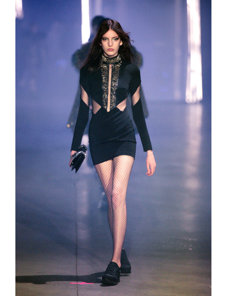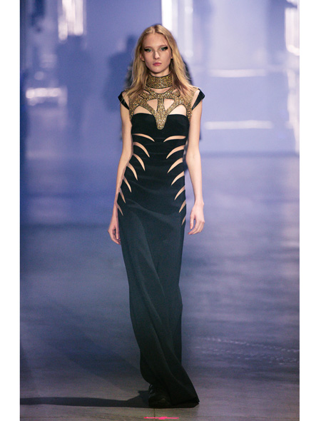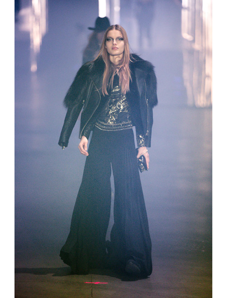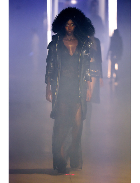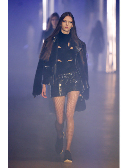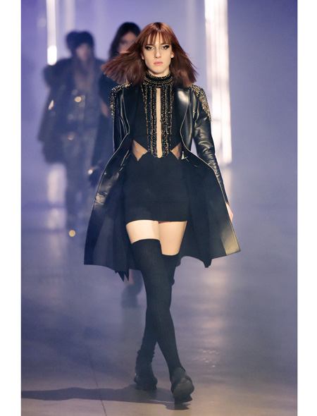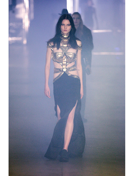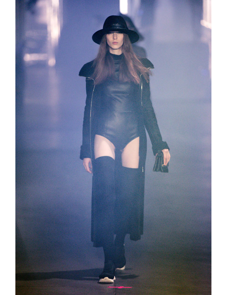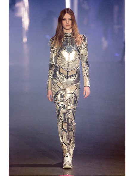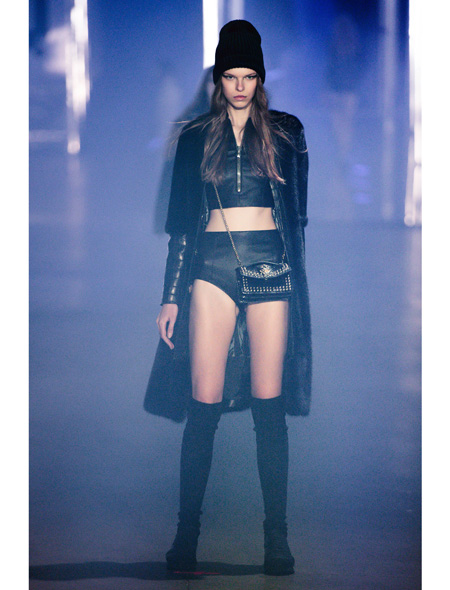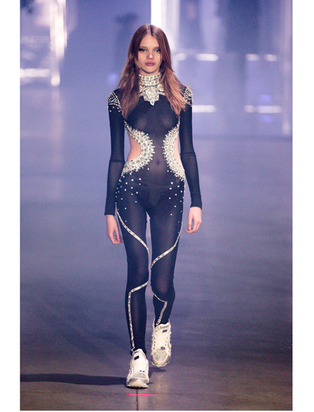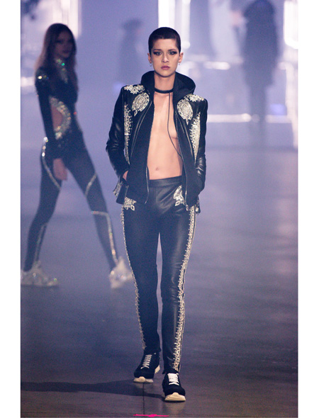 Комбинезоны и кирасы в центре внимания. Ткань, конечно же, кожа. Украшенные геометрическими вырезами и графическими металлическими кантами, расшитые вручную созвездиями кристаллов Swarovski и блестящими пайетками, вещи становятся объектом неподдельного желания .