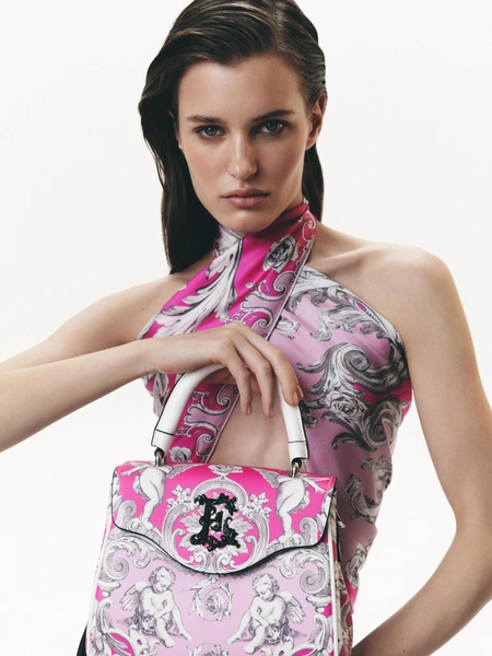 Самой обсуждаемой новинкой стала обновленная версия культовой сумки Monogram, впервые появившаяся 20 лет назад: аксессуар декорирован узорами в виде барочной лепнины и купидонами — оммаж искусству эпохи Возрождения. А главной деталью стала уже узнаваемая темная фурнитура в форме заглавной буквы «Е», приковывающая взгляды на фоне розово-белого принта.