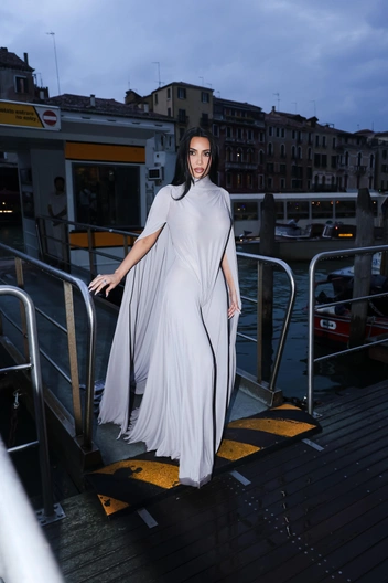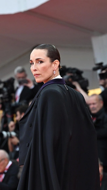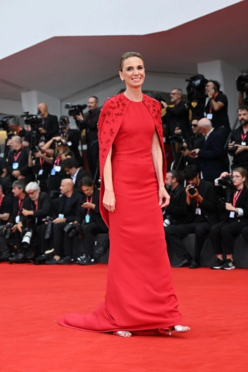 А вот Эмануэла Фанелли, ведущая 82-го Венецианского кинофестиваля, после вчерашнего серебра Armani Prive решила переодеться в красный. Сияющее платье с кристаллами она сменила на платье-колонну Alberta Ferretti с деталью в виде кейпа.