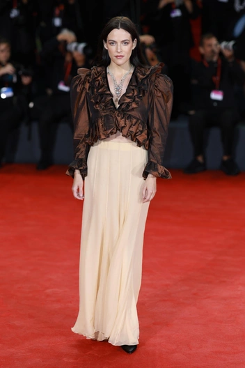 По другую сторону от «Бугонии» перед камерами позировала актриса Нуми Рапас. Еще вчера она уверенно стартовала в тотал-блэк наряде Courrèges. А сегодня представляла подиумный образ Alexander McQueen прямиком из коллекции осень-зима 2025. Правда, его актриса решила интерпретировать на свой лад: вместо викторианской блузы, как было на шоу, надела белый топ с глубоким декольте.