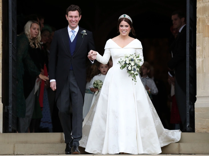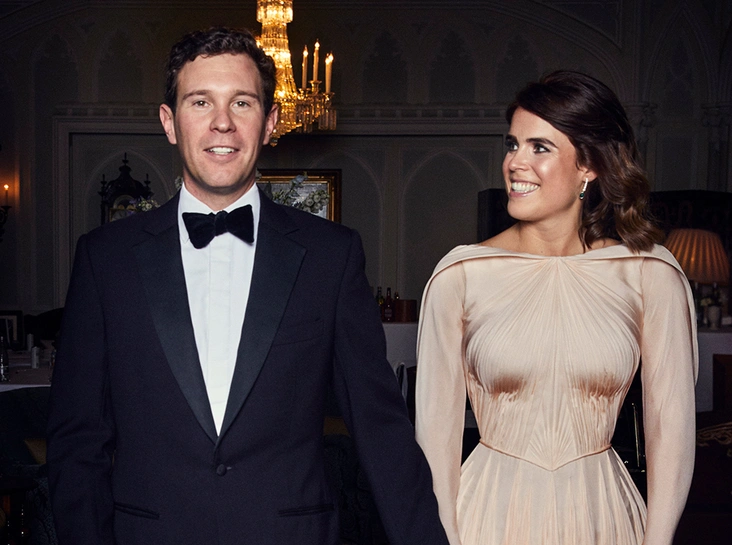 Для вечернего приема Ее Высочество также изменила прическу, выбрав мягкие локоны вместо пышного низкого пучка. Часть волос была слегка присобрана на затылке, причем в качестве заколки выступила бриллиантовая брошь королевы Виктории в виде пшеничного колоса. Это украшение Евгении одолжила Елизавета II. Сама Королева ранее появлялась с парными брошами-колосами на некоторых официальных мероприятиях. К слову, Джек Бруксбэнк также предпочел сменить традиционный для британских свадеб формальный morning suit с фраком на элегантный черный костюм.
