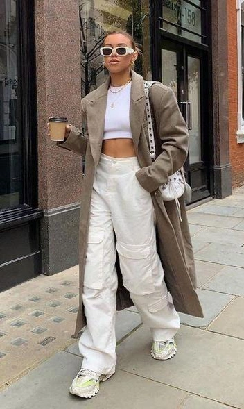 Это уже многослойный образ, а значит, более стилистически продуманный и интересный. Благодаря карманам брюки карго сделают образ не только стильным, но и функциональным. Если вы хотите продемонстрировать вашу фигуру, и при этом сделать это не слишком откровенно, то выбирайте укороченный топ. Благодаря балеткам вы придадите образу немного женственности и романтизма.
