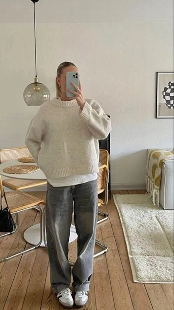 Прямые брюки свободного кроя + кеды + джемпер
