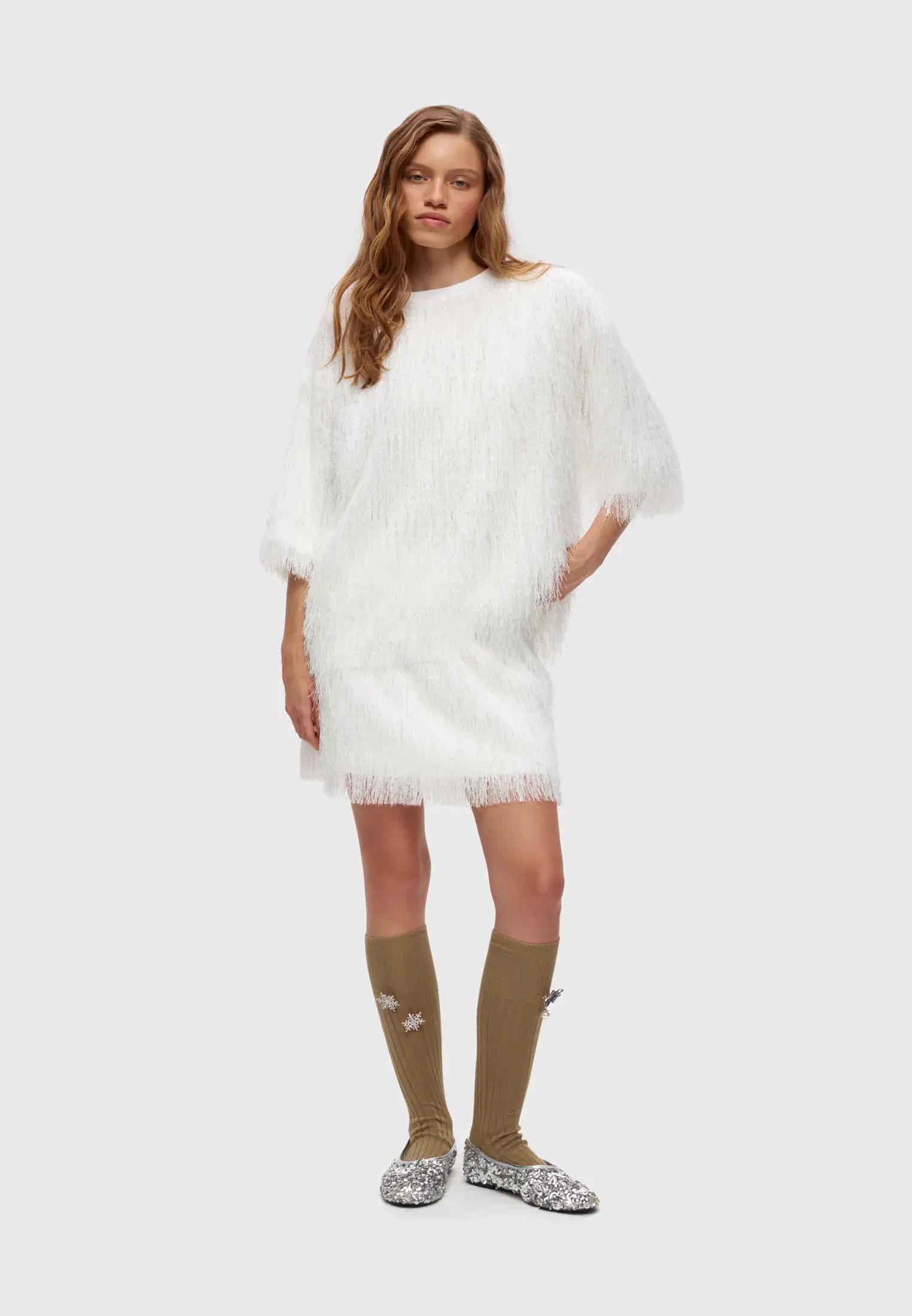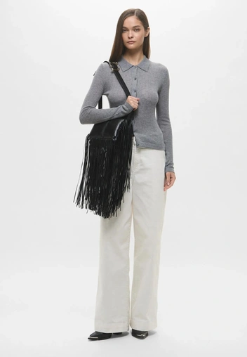 Весь секрет — в балансе. Дайте бахроме спокойно играть соло и просто успокойте весь остальной образ: к акцентному топу добавьте простые джинсы и белые кеды, к юбке с лентами — базовую футболку или лаконичную рубашку.