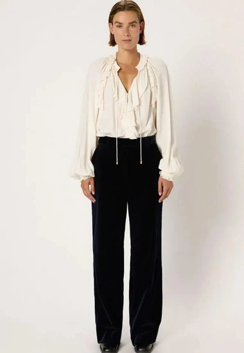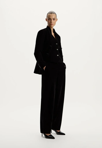 Зимние вечерние выходы сложно представить без самого роскошного материала — бархата, поэтому интегрируйте вельветовые брюки в самые разные светские образы: с корсетными топами, объемными блузами или акцентными блейзерами.