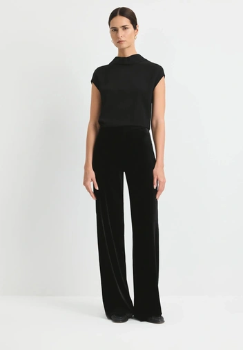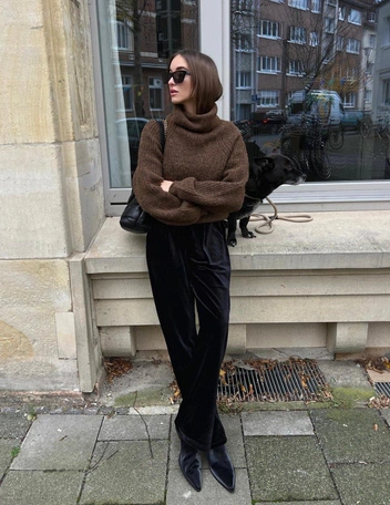 Для базовых образов сочетайте велюровые брюки с любимым трикотажем: свитерами, пуловерами и водолазками. Роскошный бархат выглядит особенно дорого с высоким горлом — добавляет аристократичности и элегантности в ваши повседневные аутфиты.