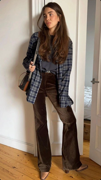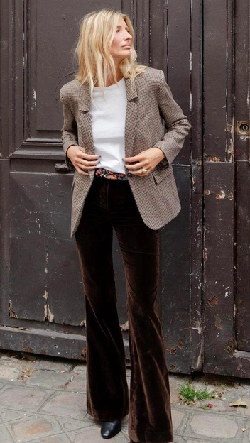 Классические пиджаки и рубашки тоже отлично сочетаются с бархатными брюками. Здесь основной фешн фокус — в игре фактур: велюр придает образу элегантность, а твидовые или шерстяные жакеты и клечатые блузы вносят нотку аристократизма.