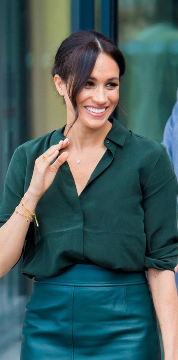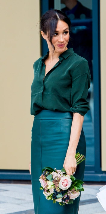 Если же хочется более яркий вариант, то обратиться следует к ранним выходам герцогини. Например, ее появлению в Парке инженерных и цифровых технологий Чичестерского университета в 2018 году. Тогда Меган носила изумрудную юбку Hugo Boss и легкую блузку подходящего зеленого оттенка.