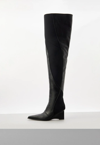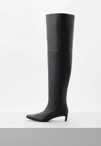 Что же касается главного акцента в образе — сапог — то здесь лучше всего присмотреться к более «просторным» моделям. Например, ботфорты Шиффер не отличаются модным в последнее время экстремально широким голенищем, но, все же не слишком обтягивают ногу. Это помогает сделать линии силуэта более контрастными и снизить градус достаточно откровенного образа (читайте также: Самая модная обувь сезона: где искать идеальные ботфорты (и с чем их носить)).