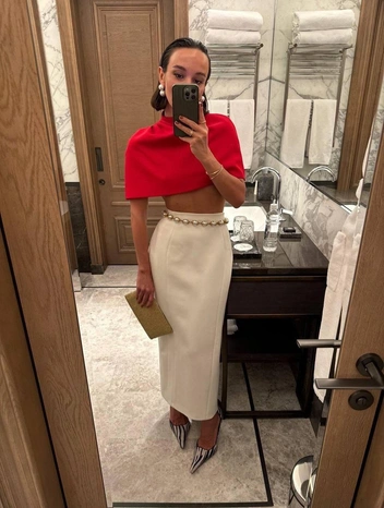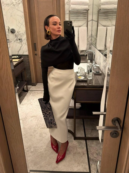 Самый простой способ вписать акцентный кейп в повседневный гардероб — носить его с боди. Это идеальная база: ничего не мешает, «не ломает» линию плеч, а силуэт получается чистым и собранным. Лучшим дополнением станут длинные кожаные перчатки, особенно если кейп меховой — такой дуэт сразу отсылает к винтажной голливудской эстетике 80-х и вы точно почувствуете себя Мишель Пфайффер или певицей Шер. Чтобы образ не был слишком предсказуемым, поиграйте с цветом: например, молочный кейп с шоколадным боди и ярко-красный акцент в обуви или сумке (читайте также: Королева «голых» платьев: самые эпатажные наряды Шер, которые вошли в историю).