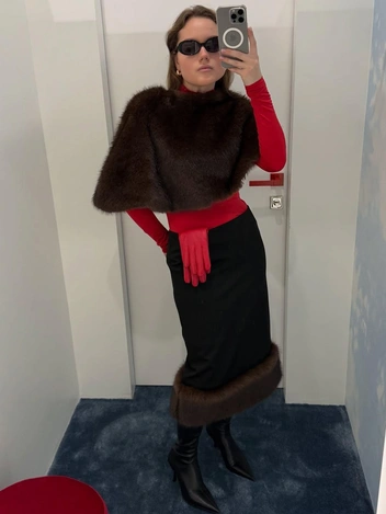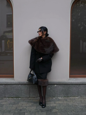 С пальто укороченные меховые кейпы работают как эффектный акцент и дополнительный утепляющий слой. Это тот случай, когда функциональность и стиль идут рука об руку: вы реально теплее одеты и при этом выглядите как модель с модного подиума. С куртками и пуховиками лучше всего сочетаются костюмные кейпы — они собирают объемный верх и делают образ более структурным, а с классическими пальто — меховые асимметричные модели. Дополнительно поддержите цвет кейпа аксессуарами в тон или поиграйте в классику — монохромные тотал-луки всегда выглядят дороже.