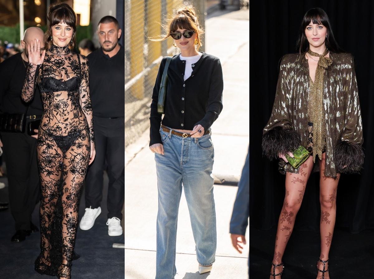 Кружевные наряды, боди и «голые» платья Дакоты почти всегда уравновешены простым силуэтом, закрытым или аккуратным вырезом и минимумом украшений, поэтому в них читается не желание шокировать, а уверенность в себе и свобода.