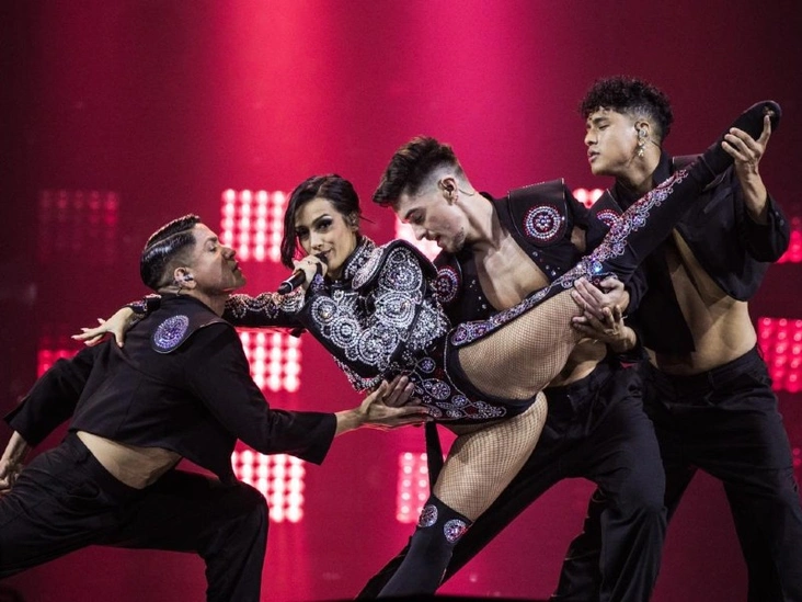 Знойная красотка из Испании выбрала себе очень модное имя Chanel. На сцене певица сделала ставку на смелое боди, расшитое пайетками и цветными камнями, которые девушка сочетает с высокими ботфортами и сетчатыми колготками.