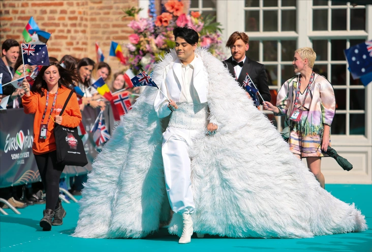 23-летний исполнитель из Австралии выбрал эпатажный тотал-лук с брюками-шароварами, акцентным корсетом на талии, укороченным жакетом и, конечно, эффектным кейпом с длинным шлейфом из белых перьев. В подобном аутфите певец выступал и на сцене: Шелдон оставил костюм, но заменил кейп юбкой со шлейфом, а завершил образ блестящей вуалью на лице из серебристых страз (читайте также: Стыдно вспомнить: 10 культовых выпускных нарядов из кино, о которых раньше мечтали все).