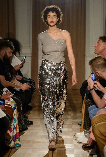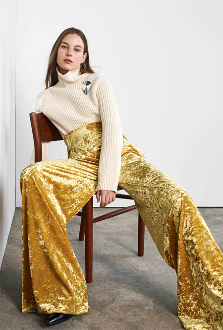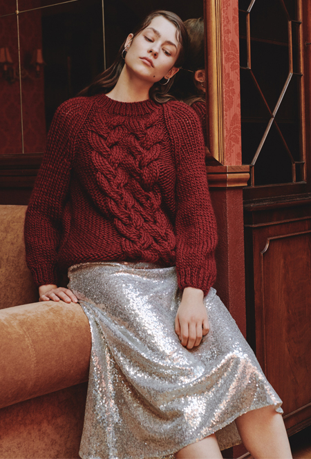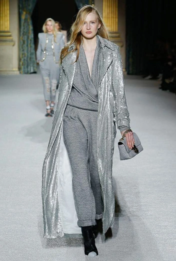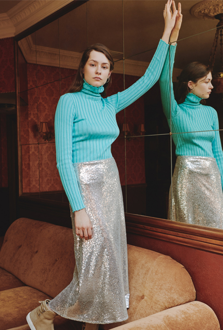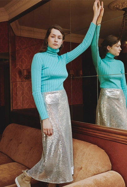 Чтобы уравновесить довольно акцентные вещи оттенка металлик, усыпанные пайетками, стразами или стеклярусом, на помощь приходит базовый трикотаж. Носим облегающие водолазки с сияющими брюками-клеш или свободный комбинезон с серебристым пальто — в таких простых сочетаниях эксцентричные пайетки перестают быть элементом вечернего дресс-кода.