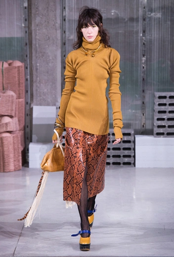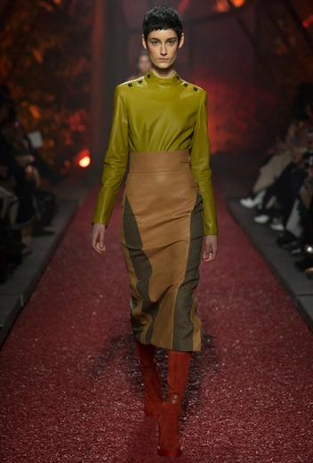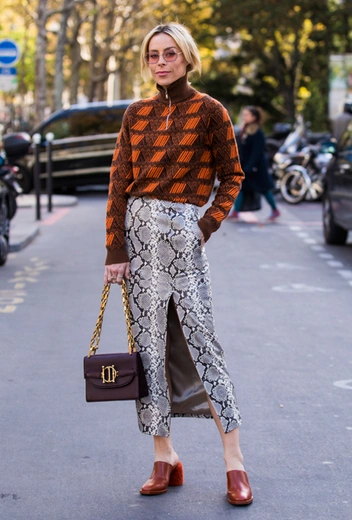 Самый актуальный материал 2018 года, который остается и в коллекциях 2019, сейчас точно представлен в изобилии. Матовая кожа и глянцевый латекс легко комбинируются вместе и при этом не выглядят вызывающе и неуместно. Самые интересные ансамбли рождаются при сочетании вещей с разными принтами: питона с благородными винным или изумрудным, как у Marni, или оливковой кожаной водолазки с приталенной юбкой из аналогичного материала, как показали Hermès.
