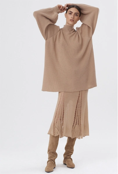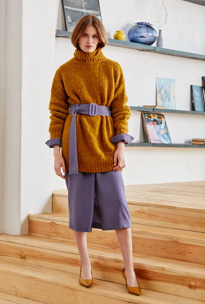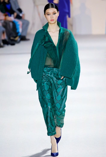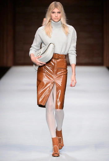 Одна из самых популярных комбинаций осенне-зимних коллекций — водолазка из тонкого трикотажа в паре с плотной кожаной юбкой. Противостояние невесомых и тяжелых материалов будет не таким очевидным, если носить юбку вместе с уютным свитером, как на показе Elisabetta Franchi — такой дуэт будет выглядеть сдержанно даже вместе с экстраординарным латексом.