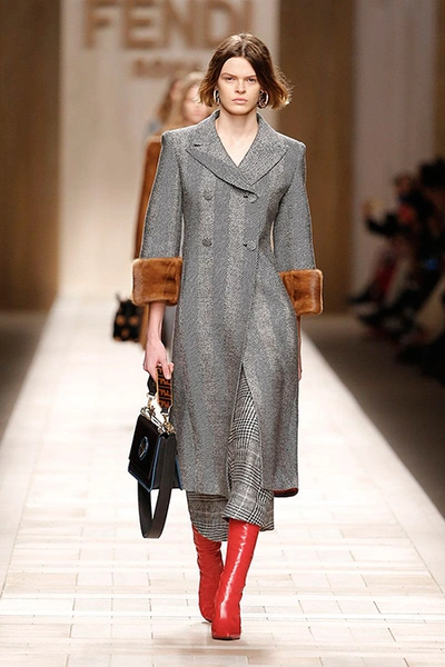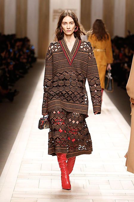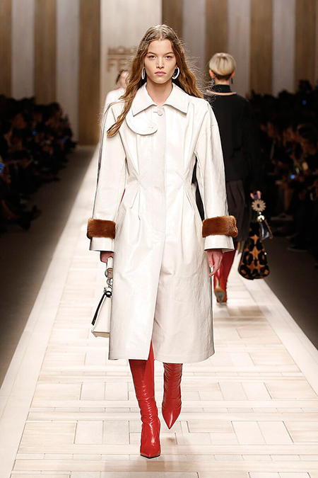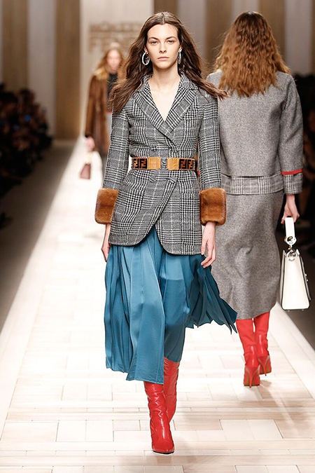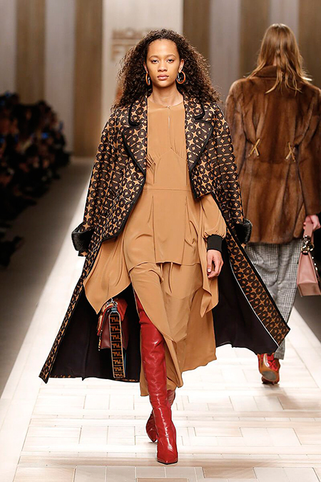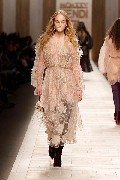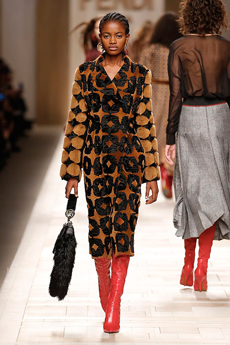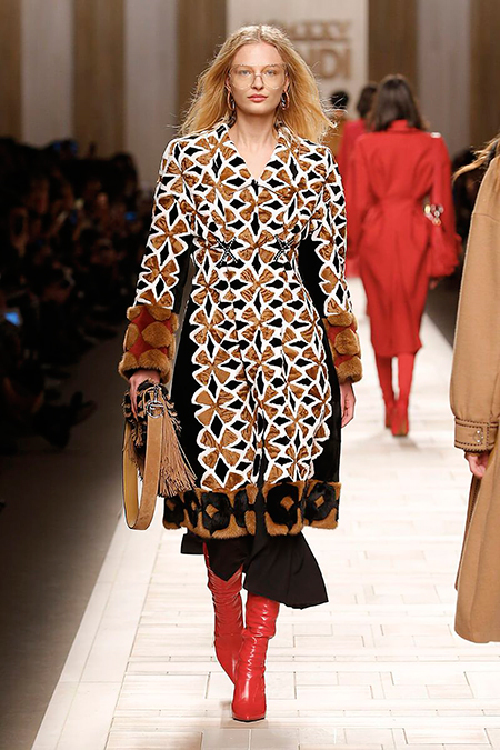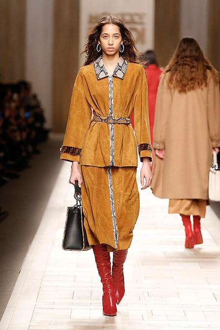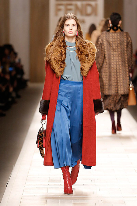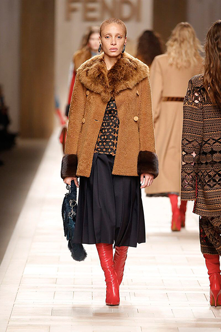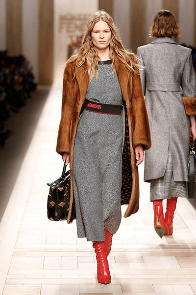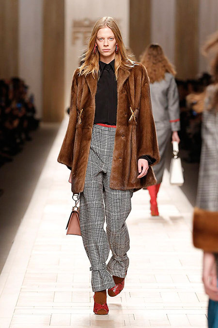 Семидесятые годы продолжили свое торжествующее шествие и на шоу Fendi. Но Карл Лагерфельд не был бы собой, если бы не был гением. Его ракурс видения этого десятилетия несколько иной. Коллекция получилась очень взрослая, достаточно строгая и лаконичная. Во всех образах, в пальто, шубах, юбках, платьях ощущается тесное сплетение мужского и женского начал. Первое – в традиционно мужских тканях, второе – в деталях силуэтах. Как, например, в открывающем шоу образе – грубом твидовом пальто с подчеркнутой талией и меховой оторочкой.