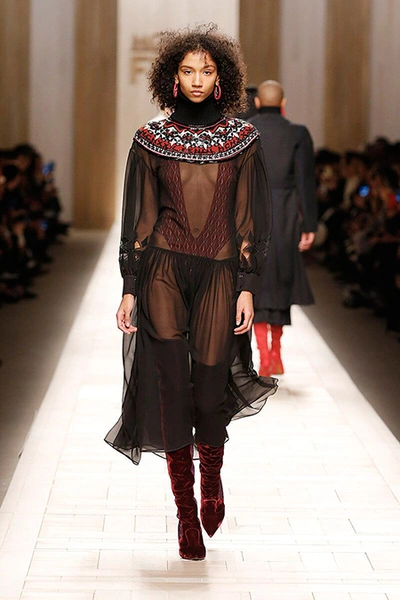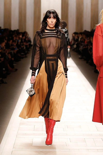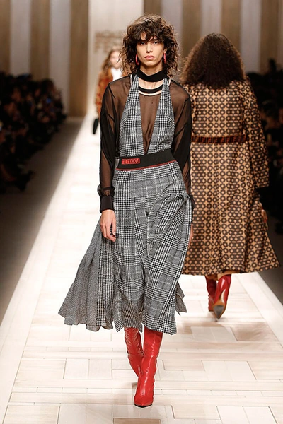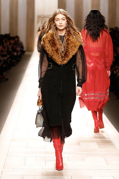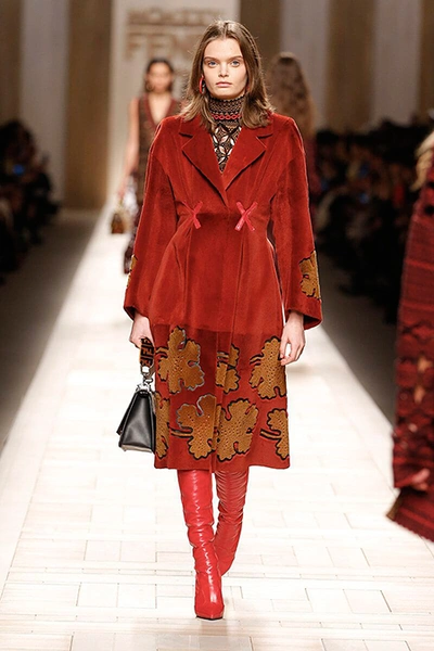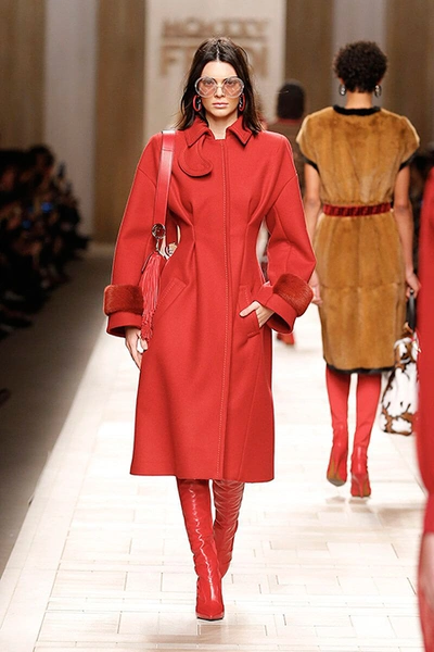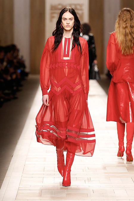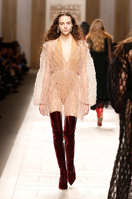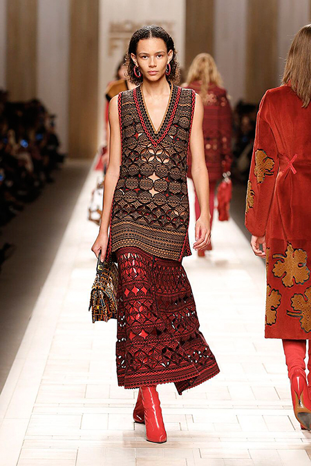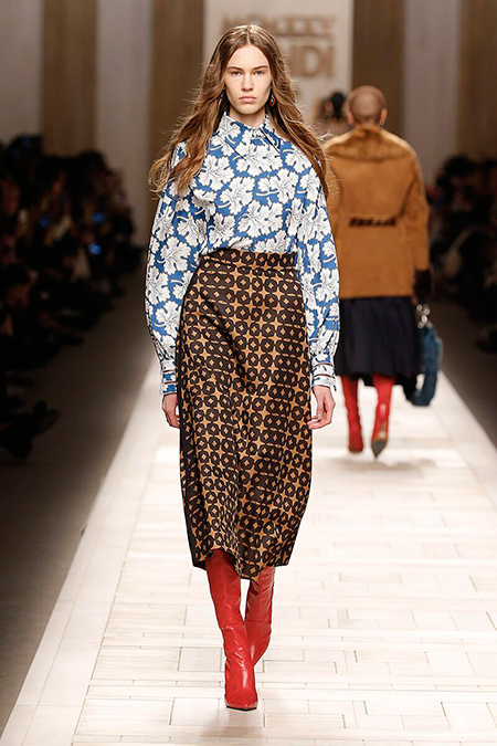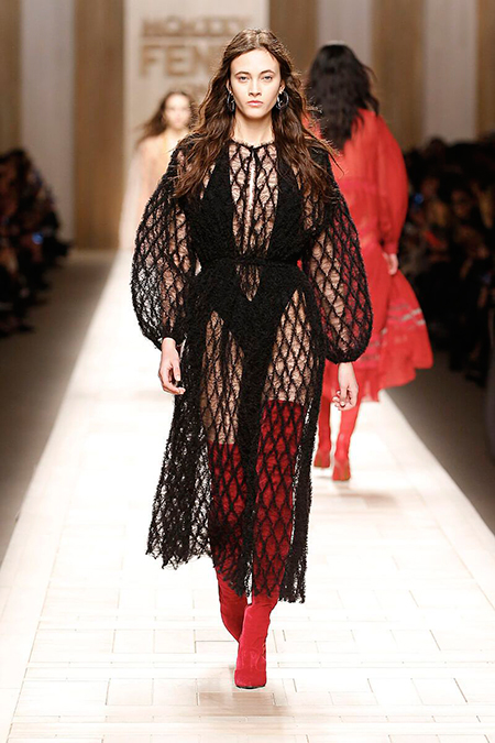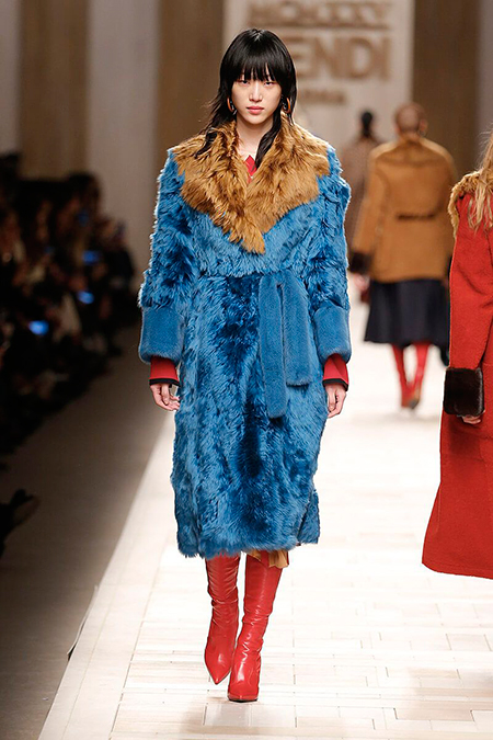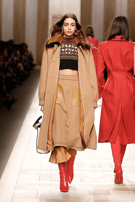 Семидесятые годы продолжили свое торжествующее шествие и на шоу Fendi. Но Карл Лагерфельд не был бы собой, если бы не был гением. Его ракурс видения этого десятилетия несколько иной. Коллекция получилась очень взрослая, достаточно строгая и лаконичная. Во всех образах, в пальто, шубах, юбках, платьях ощущается тесное сплетение мужского и женского начал. Первое – в традиционно мужских тканях, второе – в деталях силуэтах. Как, например, в открывающем шоу образе – грубом твидовом пальто с подчеркнутой талией и меховой оторочкой.