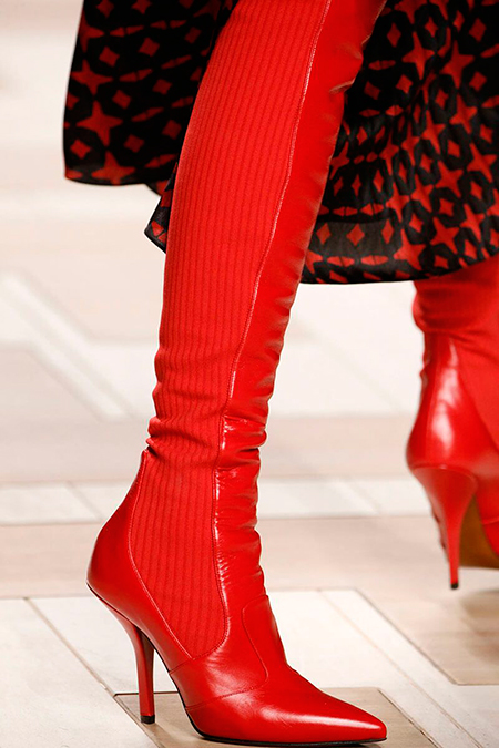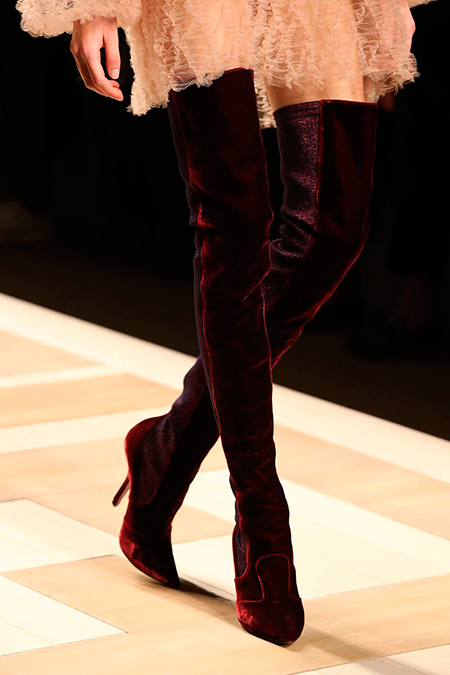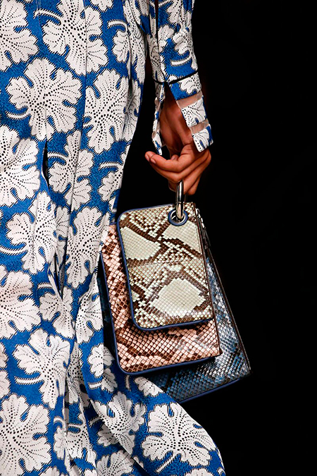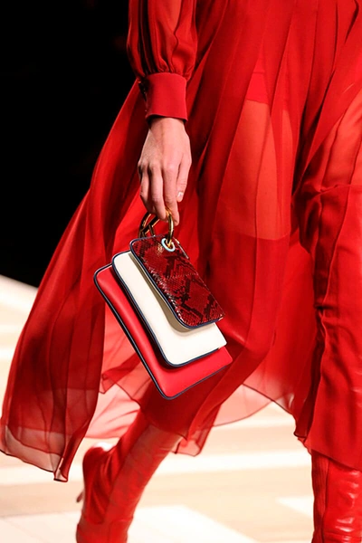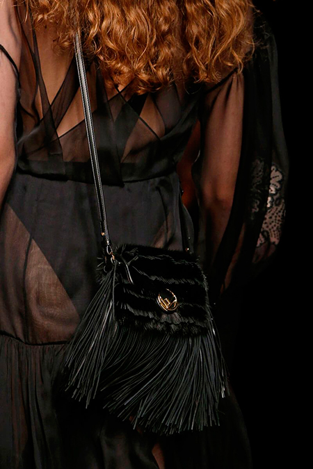 Отдельного разговора требуют аксессуары. Итого: продолженная тема носки/туфли, у которых каблук заметно смещен к центру для максимального удобства, бархат, выделанный под каракуль, ковровая технология «тапестри», в которой выполнены модели с узнаваемым лого, новая модель знаменитой сумки Багет с самой явной цитатой 70-х годов, бахромой, три клатча в сцепке с одноименным названием, микросумки Дейзи с огромными ромашками и новая звезда Дома «run away bag», которая с одной стороны намекает нам на показ, а с другой – настолько невесомая, что с ней хочется сбежать.
