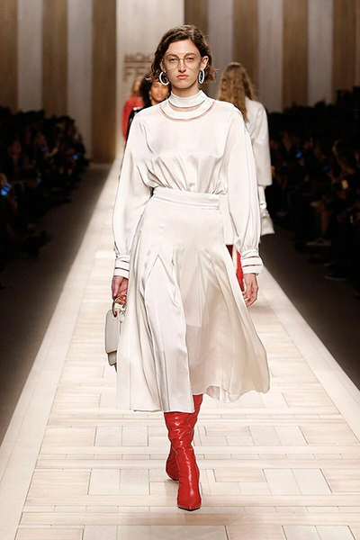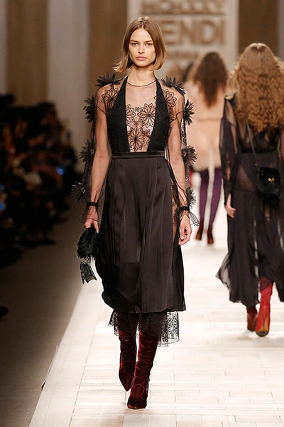 Акцентов было расставлено несколько. 1925 год – время основания Дома Fendi в Риме – то и дело указывался римскими цифрами, украшающими одежду как очевидно, так и не очень. Кроме того, если присмотреться к шубе, то талия подчеркнута римскими десятками. Цветок коллекции – ромашка, которая проявлялась в аксессуарах и потом и в одежде, а уже ближе к финалу расцвела на многих платьях.