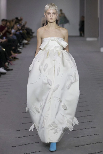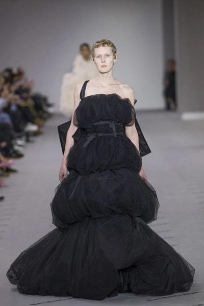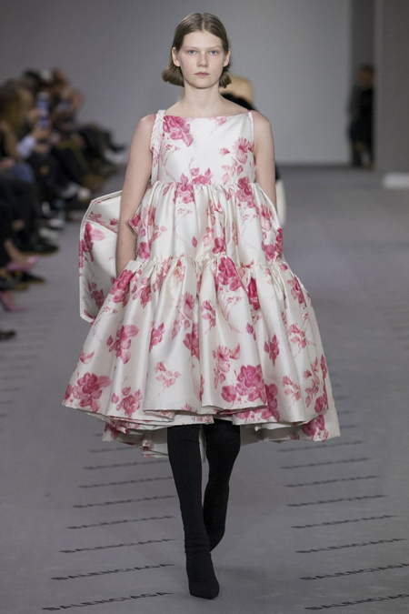 И снова на подиуме был замечен горох, открывший череду вечерних платьев, посвященных столетнему юбилею.