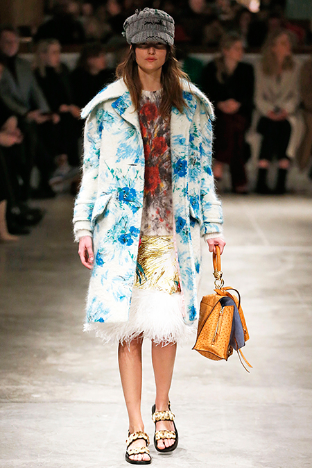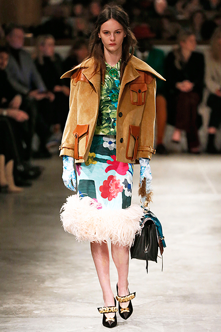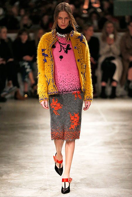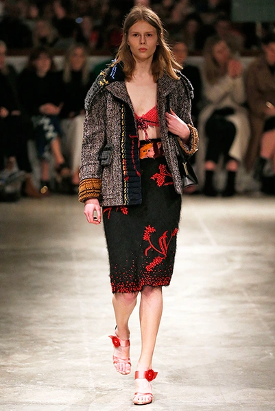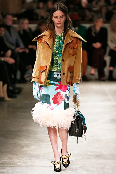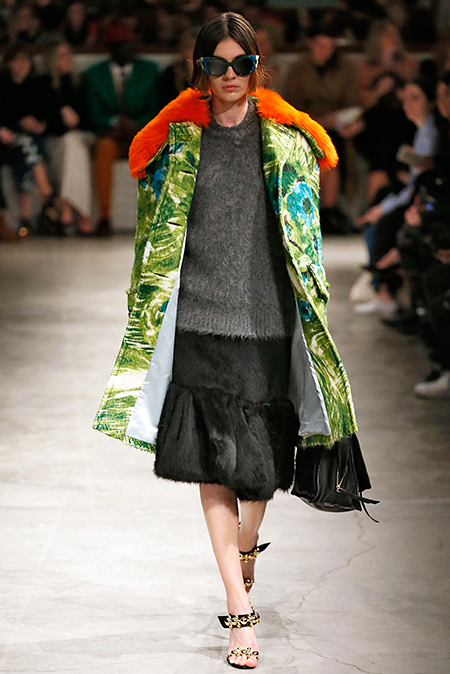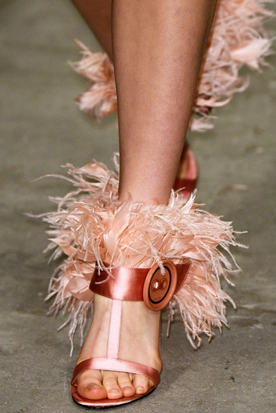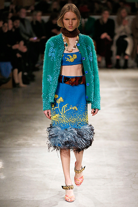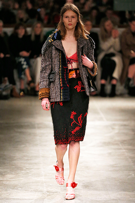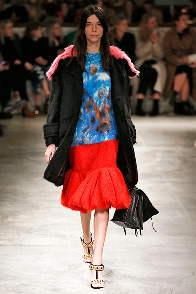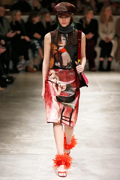 Впервые за долгое время альтернативой юбкам-карандашам и плиссе служат объемные воланы с сеткой, романтичные платья в пол и очень глубокие вырезы. Несколько образов были украшены принтами 90-летнего иллюстратора Роберта Макгиннеса, который делал плакаты к Бондианам и Завтраку у Тиффани. Плакаты вообще стали важной частью шоу, декором которого занимался Рем Колхас. Пространство напоминало то ли дом, то ли аэропорт, разделенный на зоны-лабиринты с кроватями и освещенный лампами, из которого совсем не хотелось уходить.