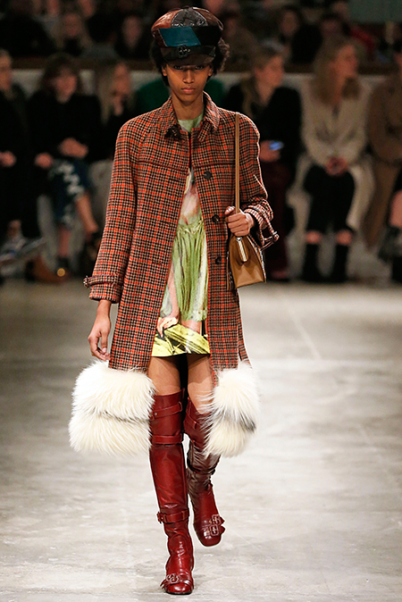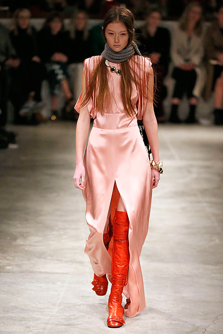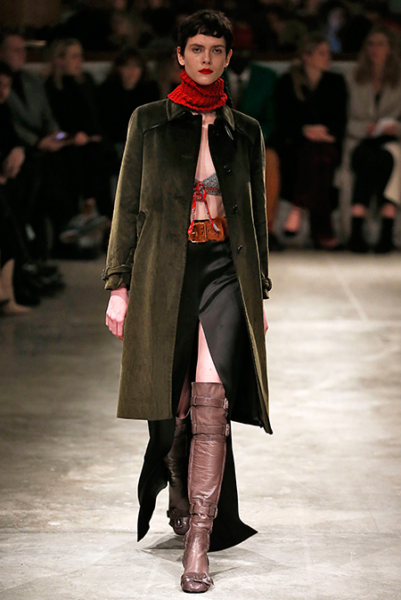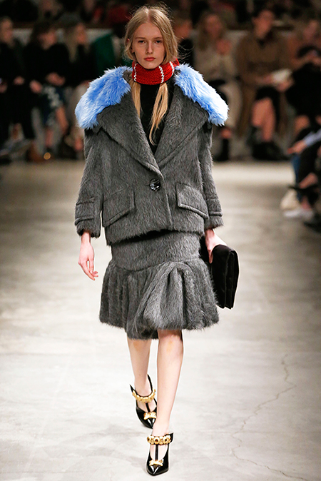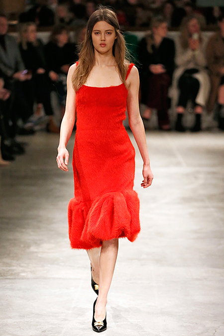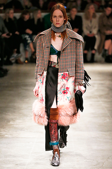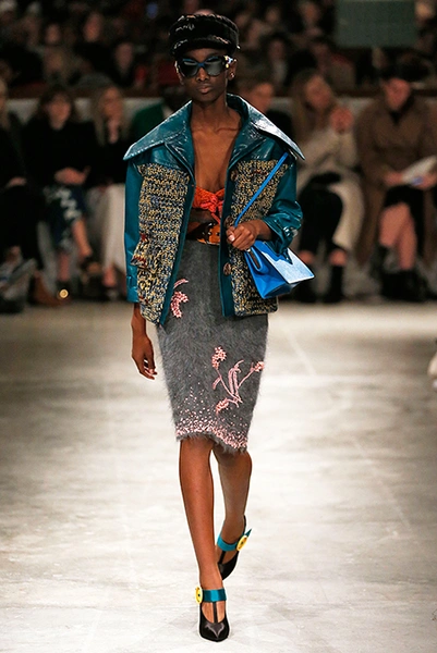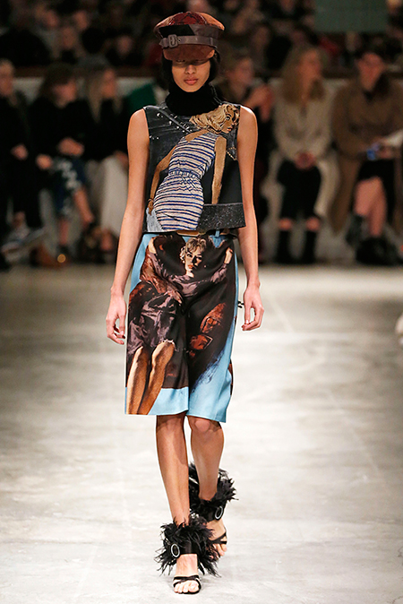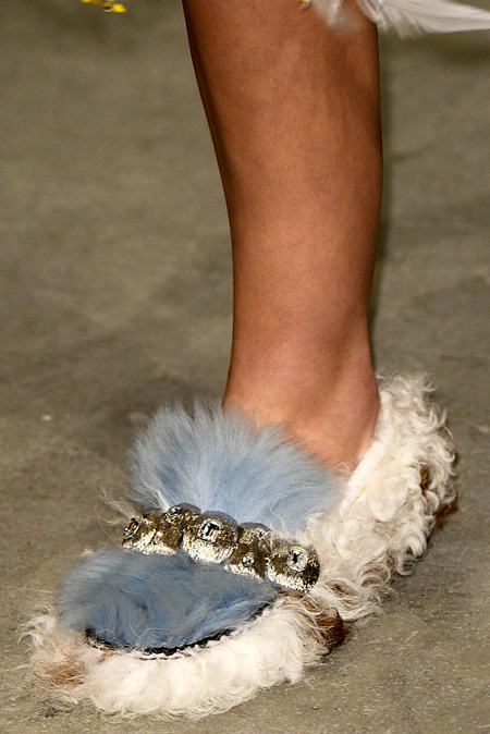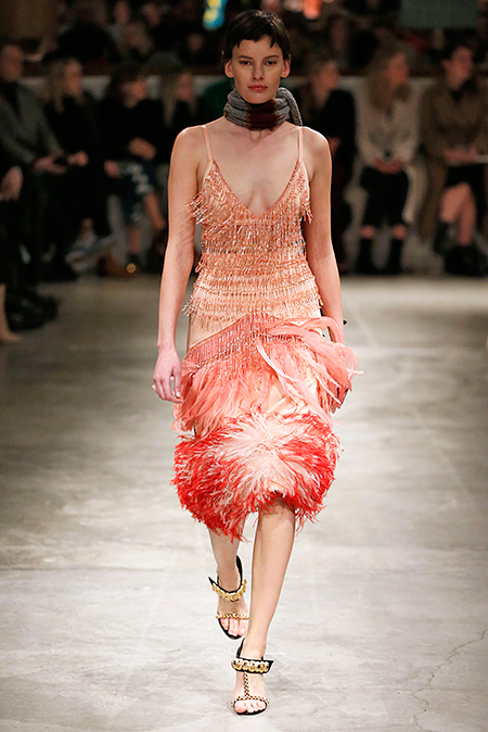 Впервые за долгое время альтернативой юбкам-карандашам и плиссе служат объемные воланы с сеткой, романтичные платья в пол и очень глубокие вырезы. Несколько образов были украшены принтами 90-летнего иллюстратора Роберта Макгиннеса, который делал плакаты к Бондианам и Завтраку у Тиффани. Плакаты вообще стали важной частью шоу, декором которого занимался Рем Колхас. Пространство напоминало то ли дом, то ли аэропорт, разделенный на зоны-лабиринты с кроватями и освещенный лампами, из которого совсем не хотелось уходить.