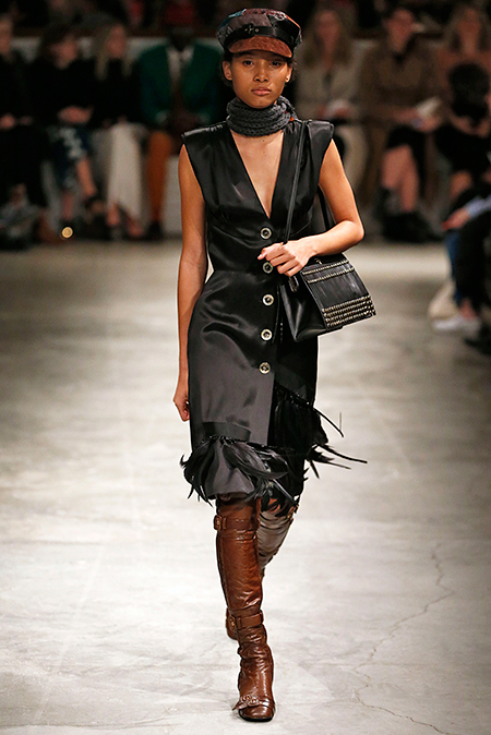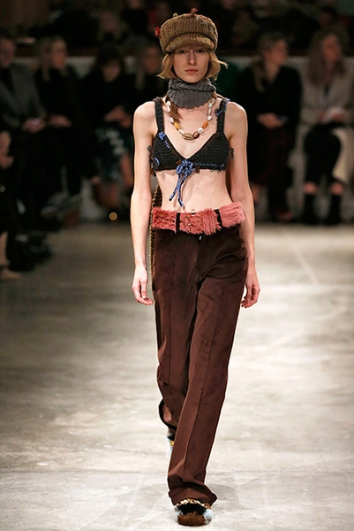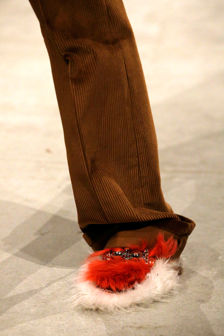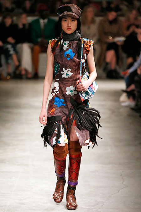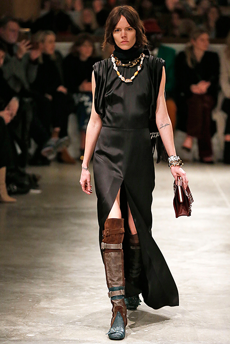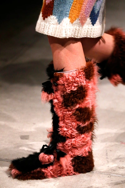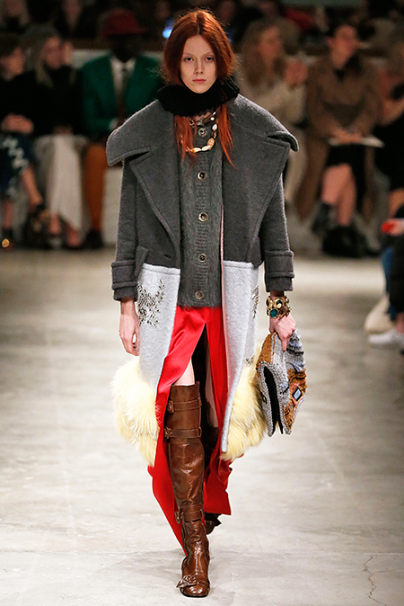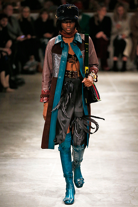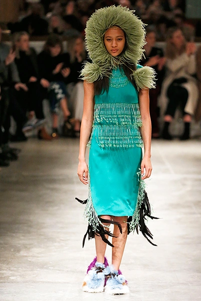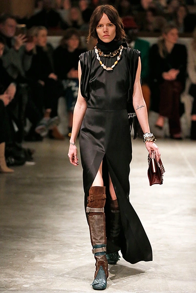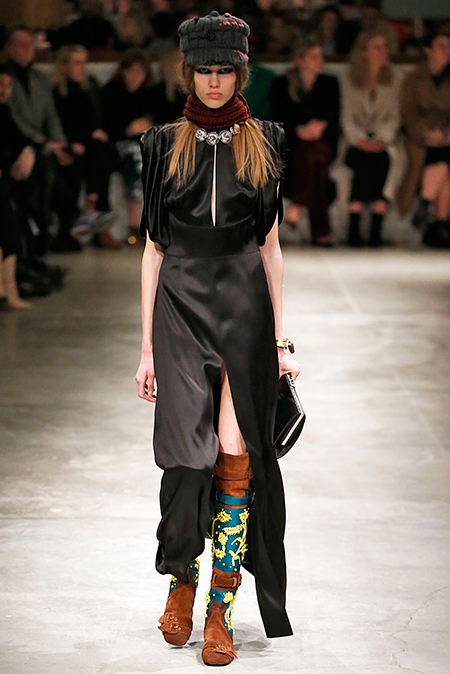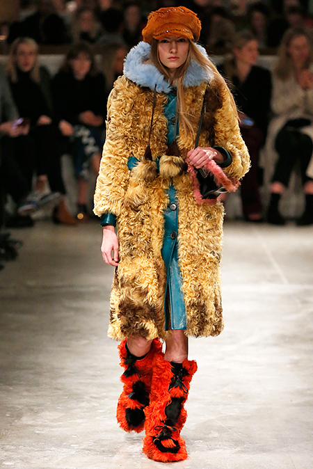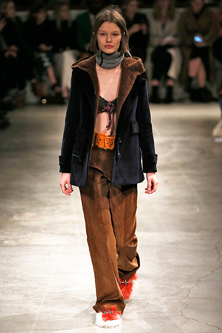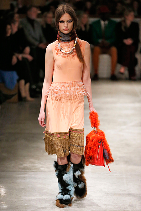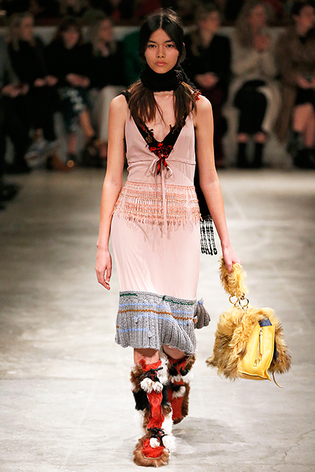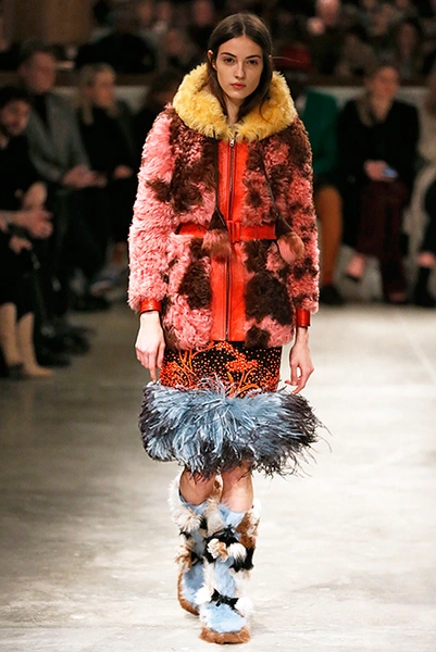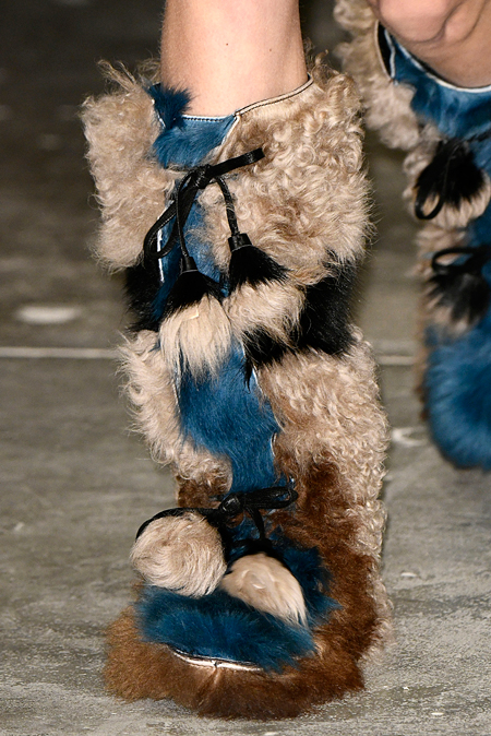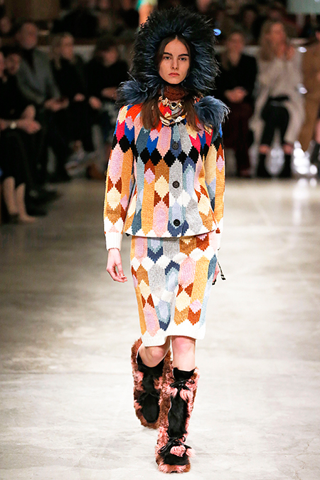 И все это в детском восприятии. Шарфы смешной вязки с декором из перьев и бусин, шапки с помпонами из перьев, деревянные пуговицы, которым уделили особое внимание, языческие амулеты-животные на браслетах и ручках сумок, колье-ракушки, ботинки-эскимосы, ангоровые и мохеровые свитера с вышивкой, куртки, пальто и платья, щедро украшенные бисером. Много вельвета, техника печворк как в сочетании тканей, коже на ботфортах, так и в вязке, традиционной для Скандинавии. Некоторые образы при этом получились невероятно женственными.